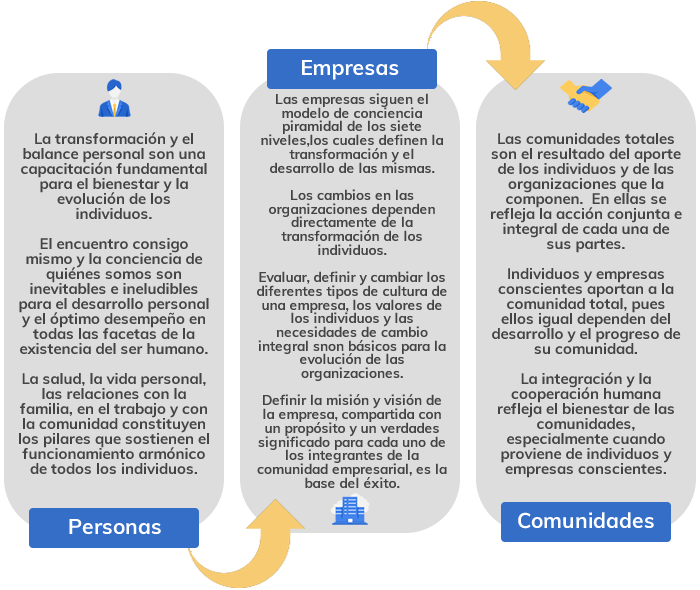 Una gran comunidad empresarial, a su vez, compuesta por Comunidades menores, o Comunidades de práctica en la cual se descubre cómo nuevas Comunidades Menores, o Comunidades de práctica pueden (TRANS) formarse en la empresa y alinearse a la estrategia total y compartida.